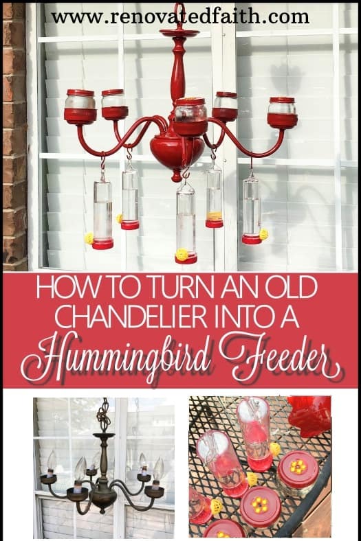 By upcycling an old chandelier, I made a DIY chandelier hummingbird feeder that is sure to turn your backyard into a hummingbird haven. #hummingbirdfeeder #chandelierhummingbirdfeeder #backyard