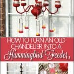 By upcycling an old chandelier, I made a DIY chandelier hummingbird feeder that is sure to turn your backyard into a hummingbird haven. #hummingbirdfeeder #chandelierhummingbirdfeeder #backyard